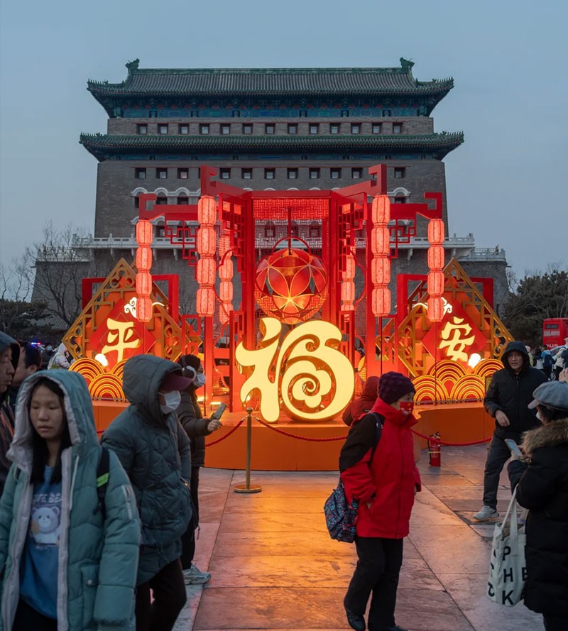 1月21日,前门大街,游客留影。春节期间,西城区将在中轴线“一南一北”的北京坊和什刹海荷花市场举办2025年新春文化坊会和冰雪嘉年华两大主题活动,其中北京坊新春文化坊会的亮点之一是重新点亮百年历史灯街。