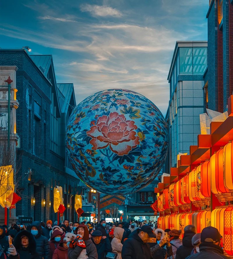 1月21日,大栅栏廊房头条,游客打卡巨大球形景观“花好月圆”。据介绍,位于北京坊街区的廊房头条,原有二十余家灯笼铺。每逢过年,各家店铺门前各种花灯竞相点燃,大放异彩,因此廊房头条有了“灯街”的美誉。蛇年新春,西城区以北京坊在地商户资源及老字号资源为基础,打造一场新春灯会,重现当年盛景。