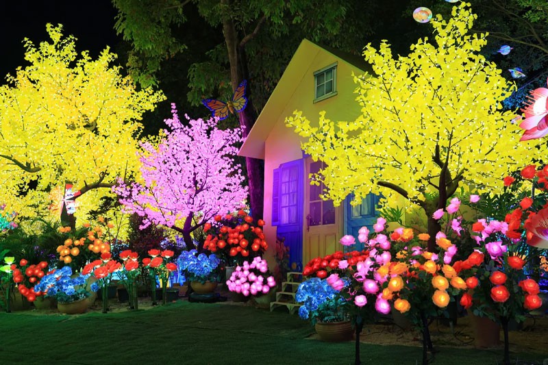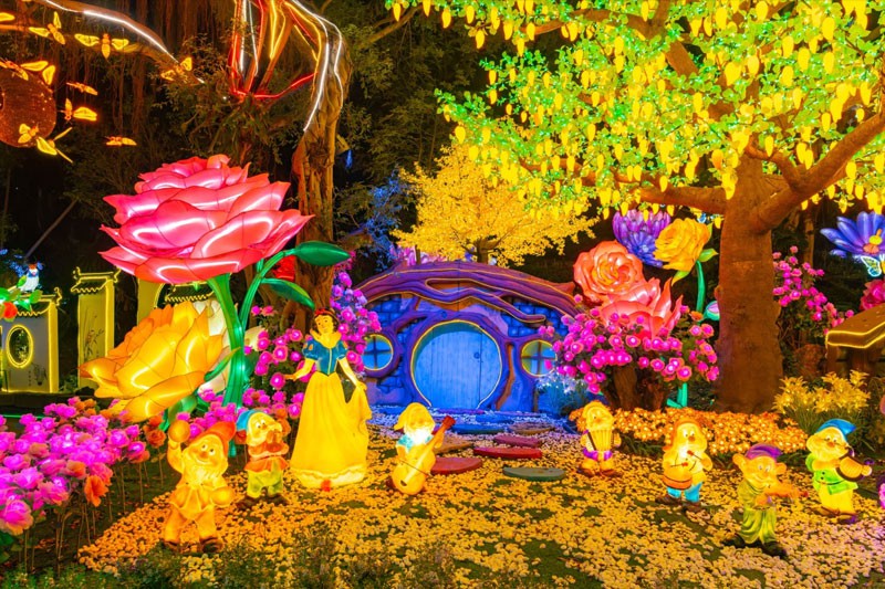 “奇花异卉”主题区,软毛猴尾柱、重楼、昙花、仙女之舞等几十种奇特花卉悄然绽放;“繁花世界”主题区运用花朵、恐龙、松鼠等不同主题气模灯组打造出一个昼夜可观的花卉主题景观;“丰收的稻田”主题区巧妙运用灯光艺术装置,生动再现广西特色农耕文明。